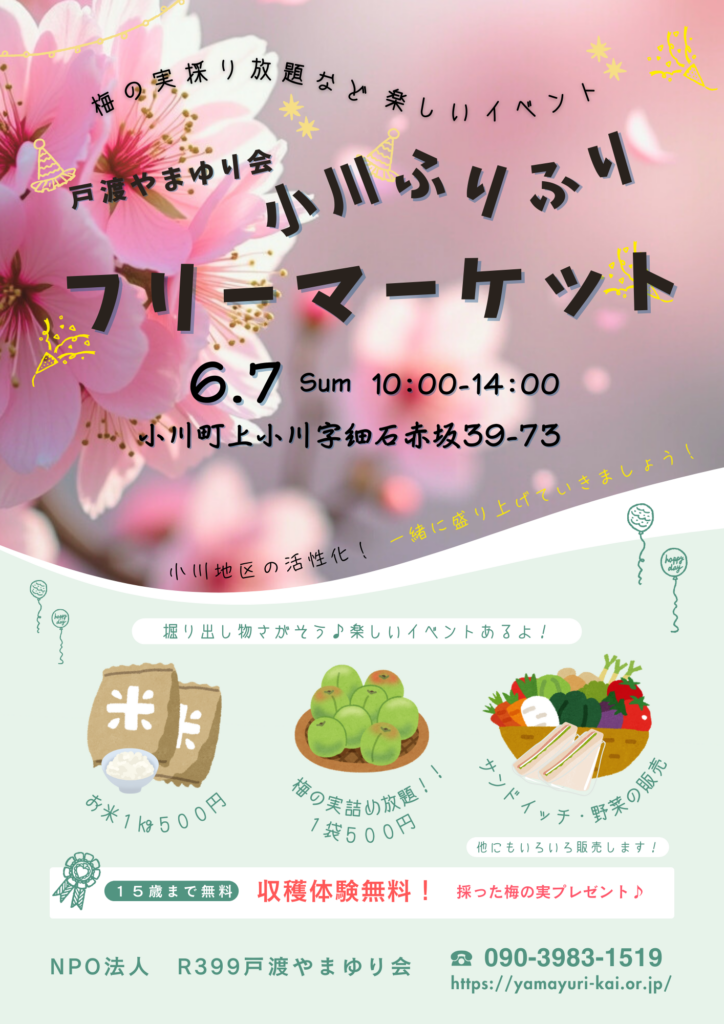 戸渡やまゆり会では6月7日(日)、「小川ふりふり フリーマーケット」を開催いたします。事務所周辺で梅の実収穫体験や詰め放題、サンドイッチ・野菜の販売も実施します。ぜひお越しください! また、フリーマーケット出店者も募集しています。出店希望の…